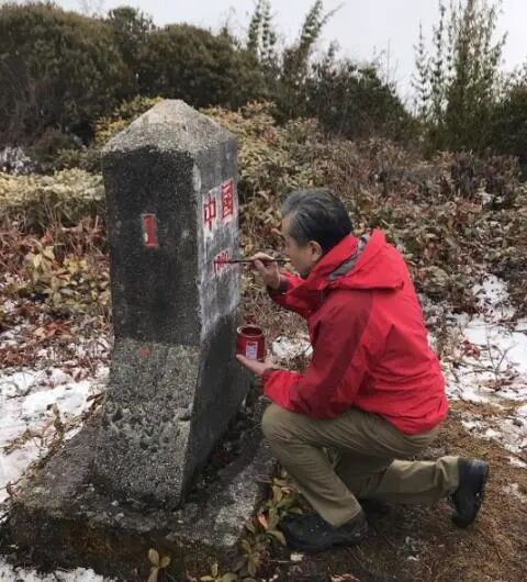 移民管理警察为“共和国一号界碑”描红填色。(陈昊摄)