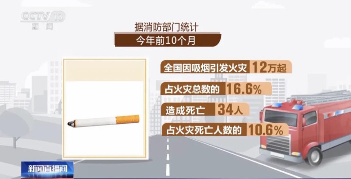 国家消防救援局发布数据显示,今年前10个月,全国因吸烟引发火灾12万起,占火灾总数的16.6%,造成34人死亡,占火灾死亡人数的10.6%。