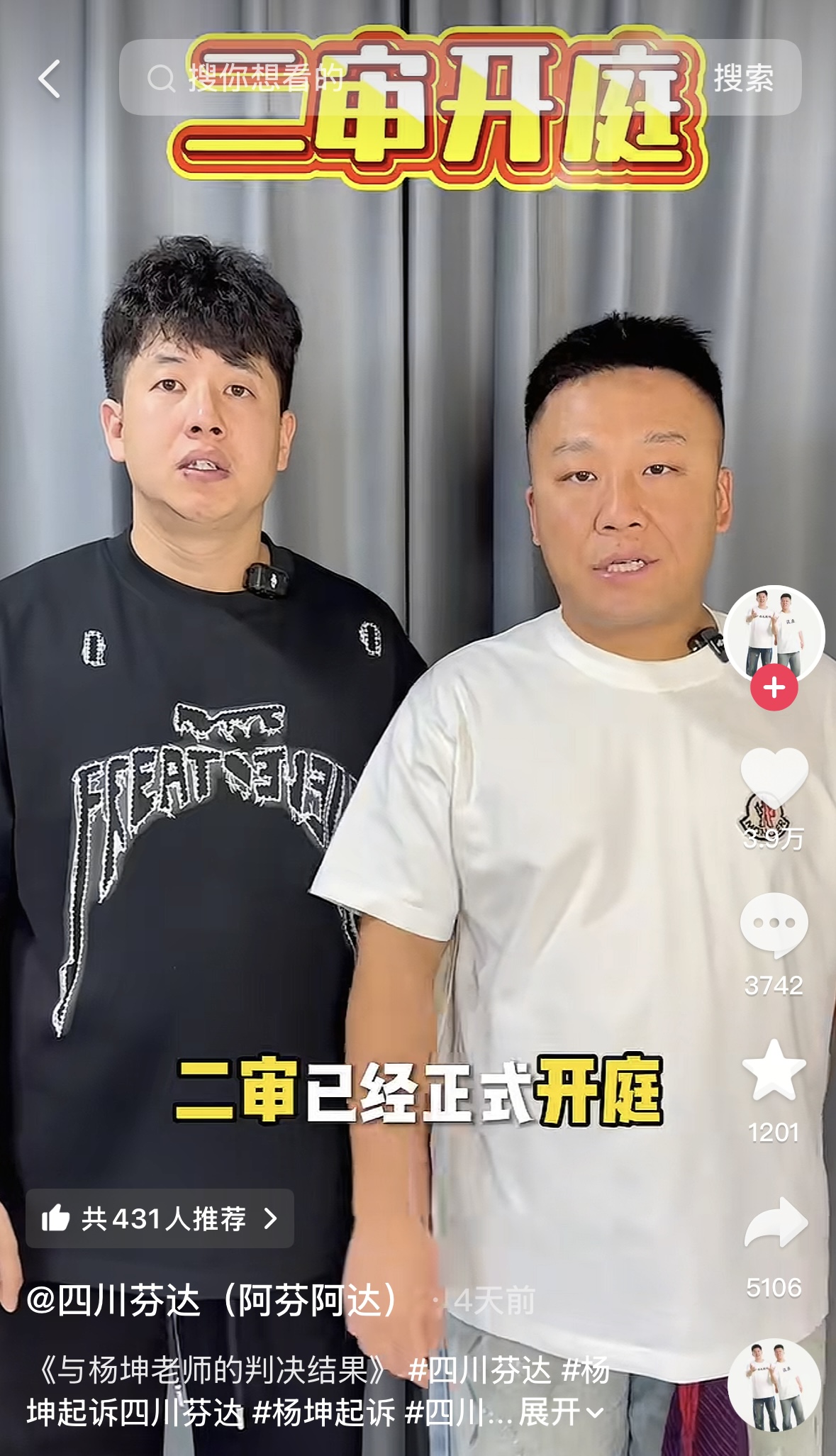 日前“四川芬达”发视频称杨坤起诉其侵权案二审已开庭