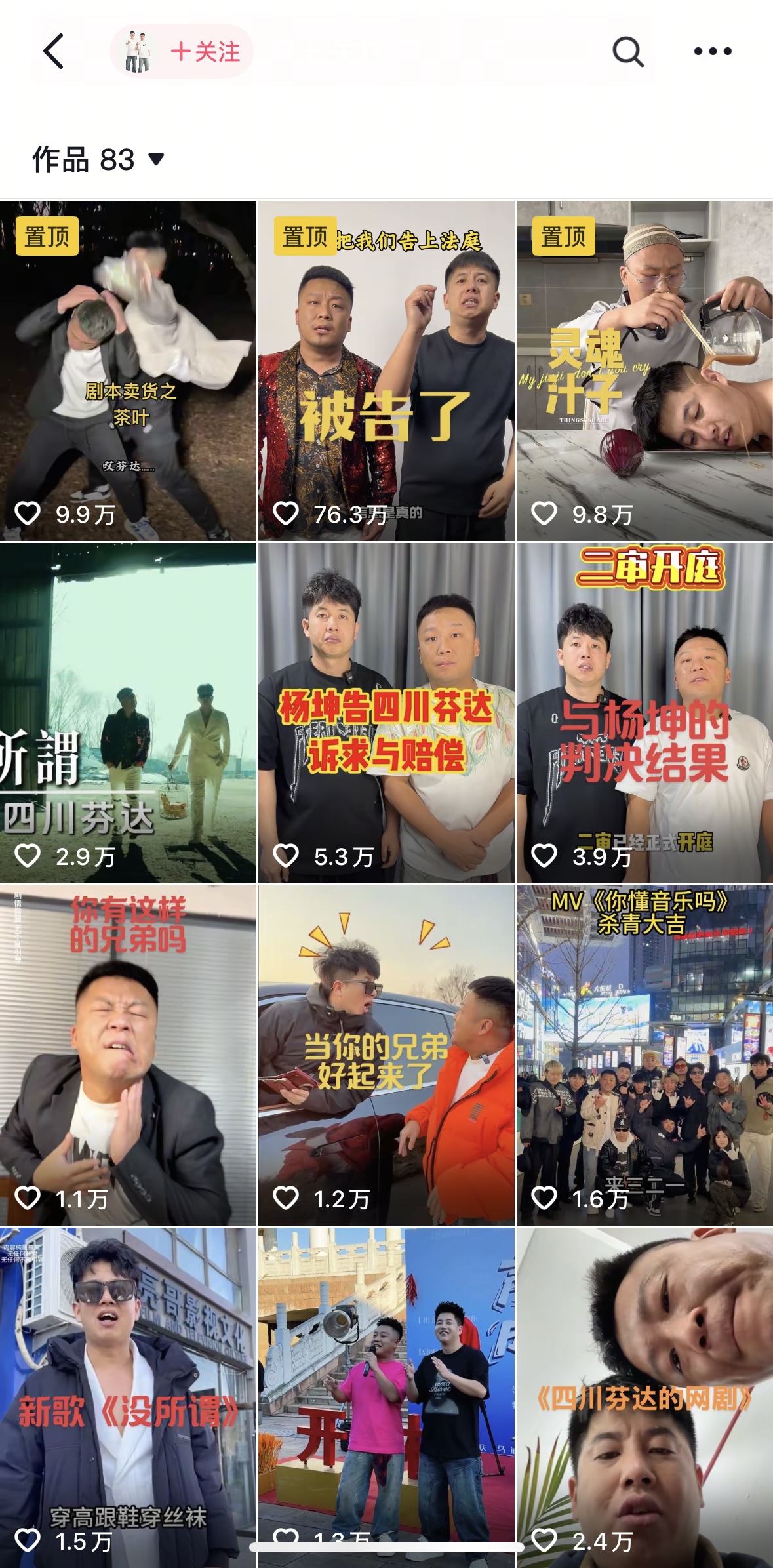 目前,“四川芬达”账号简介已删除“被杨坤起诉”一事,但他们仍将今年3月10日发布的“明星杨坤把我们告了”的视频置顶。对于网友质疑他们拿法院传票炒作,蒋某表示,只是向粉丝汇报情况。“我们用他的名气,被大家关注到了,涨了一部分粉丝,这个是肯定的,但(我们)没有拿杨老师的东西去赚钱。”