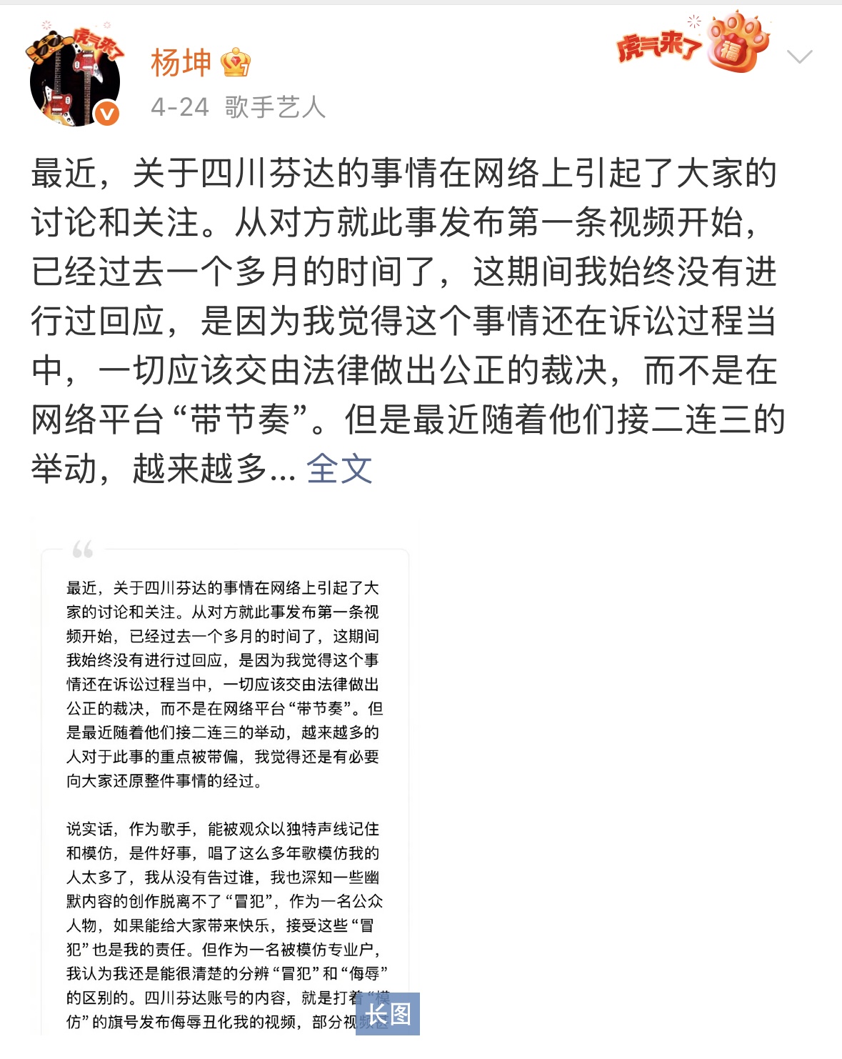 4月24日,杨坤的微博账号发文回应起诉一事。他表示,这不是针对“艺术模仿者”,而是针对举着娱乐大旗的“网络施暴者”:“四川芬达账号的内容,就是打着‘模仿’的旗号发布侮辱丑化我的视频,部分视频甚至充斥着低俗擦边内容,完全脱离了‘模仿’的范畴。”